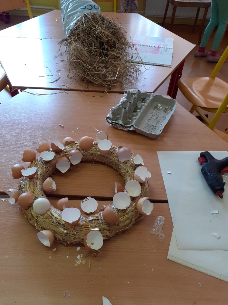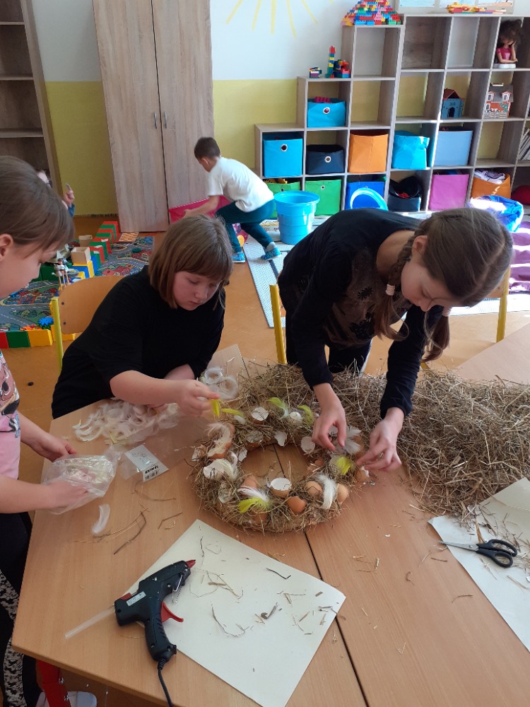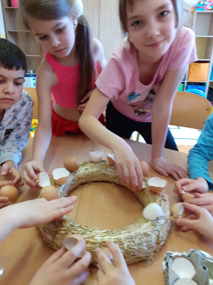 A je hotovo. Společné tvoření velikonočních dekorací žáky 1. a 2. oddělení velmi bavilo.