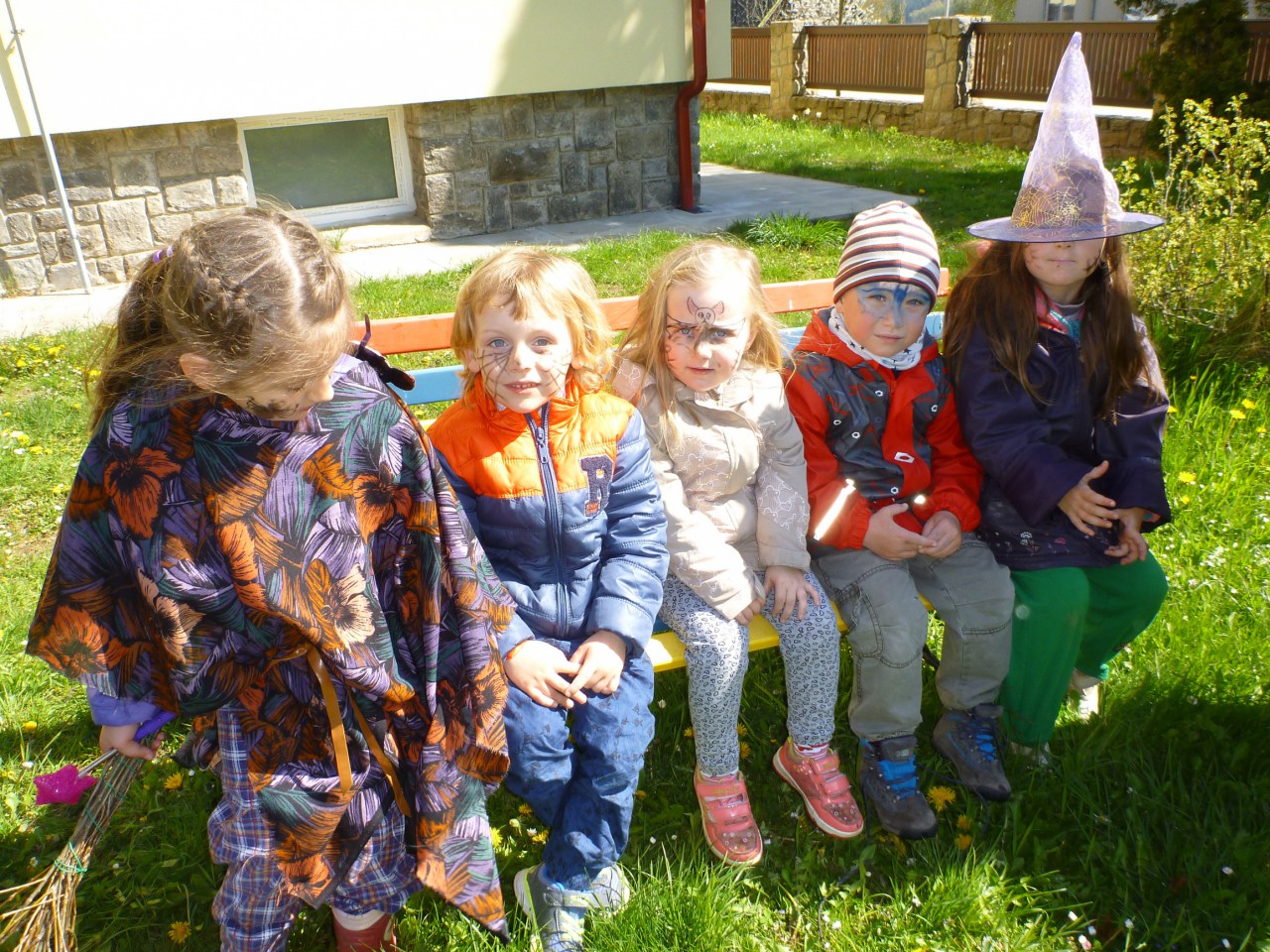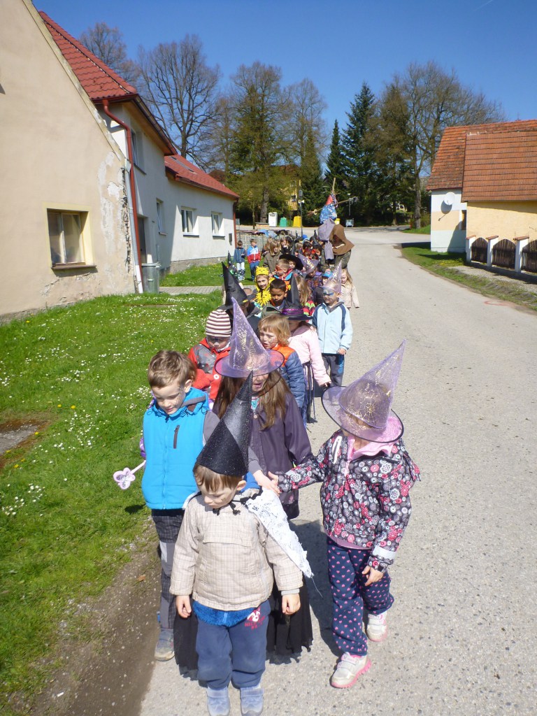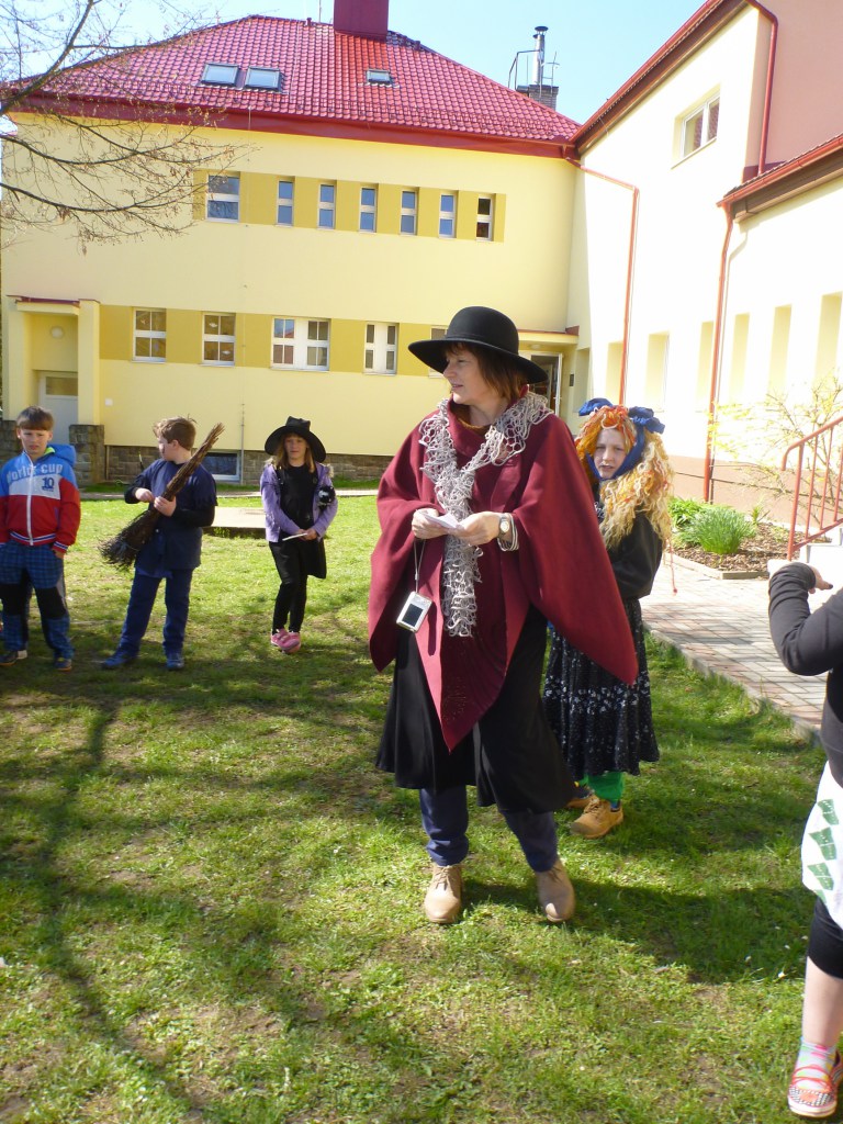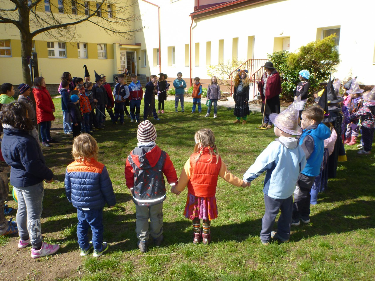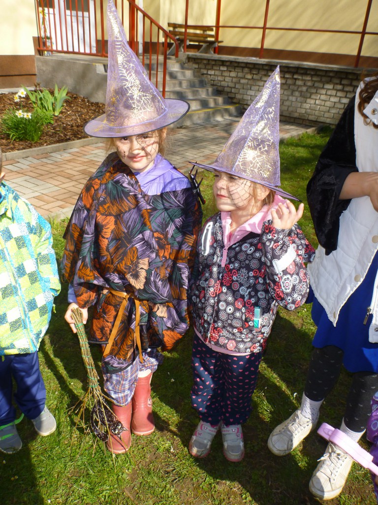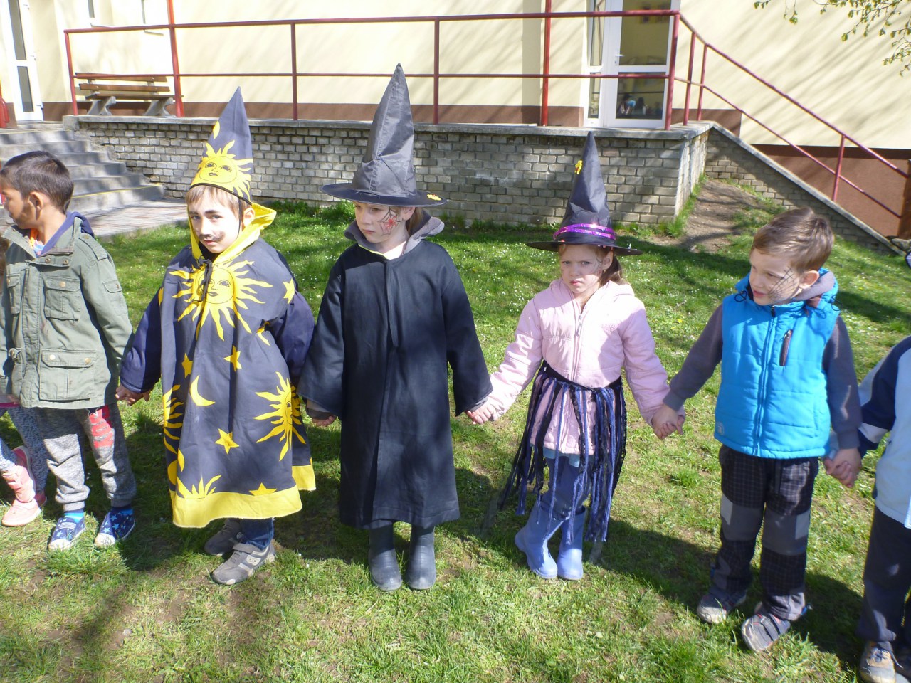 jsme si užili pálení čarodějnic. Ve slunečný den 29.4. jsme všichni - žáci, děti, učitelky vyrazili k pranýři na náves a kolem hasičárny zpět do školy v přestrojení v hrůzostrašné i mírumilovné čarodějky a čaroděje. Cestou jsme zpívali čarodějné písně a různá zaříkávadla. Doufáme, že jsme nikoho příliš neočarovali. Ve školní zahradě jsme pak upálili naši Moranu a snad se tak už zima nebrátí a čekají nás již jen samé příjemné jarní dny...