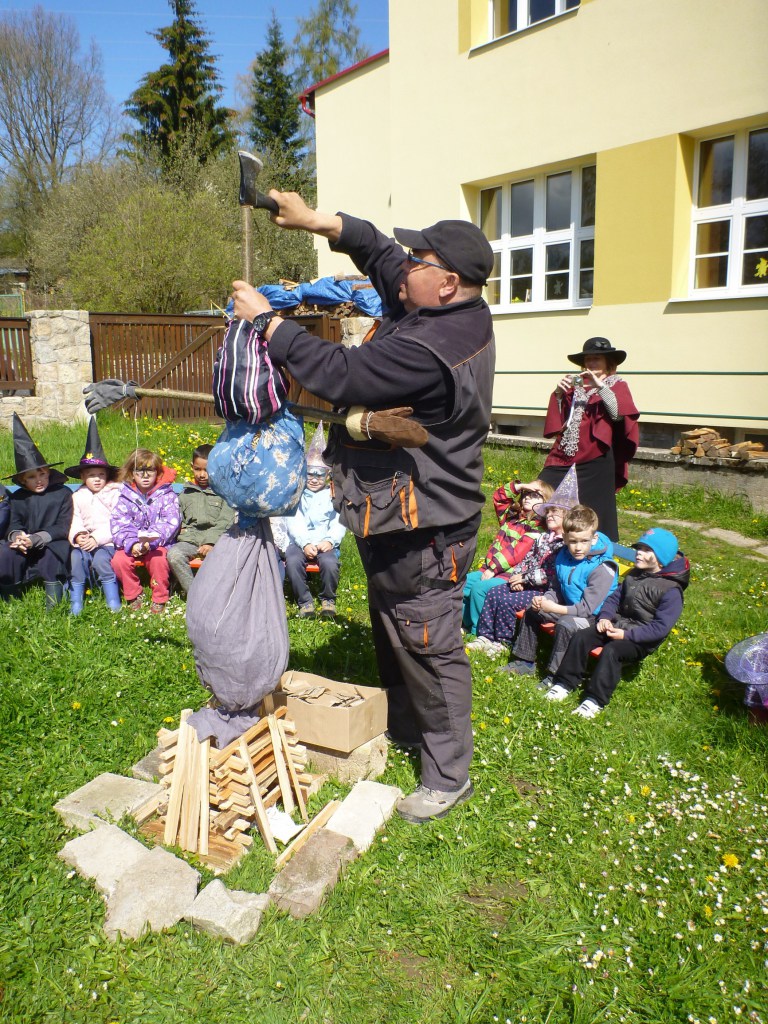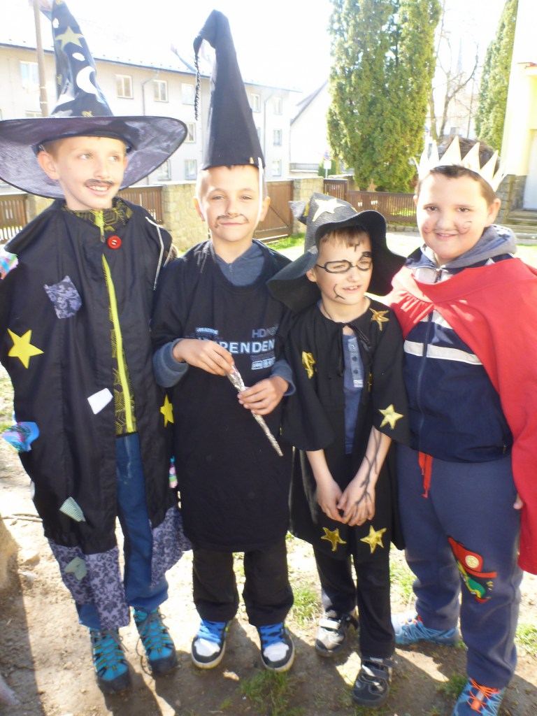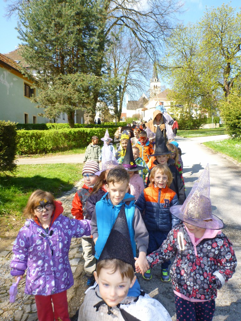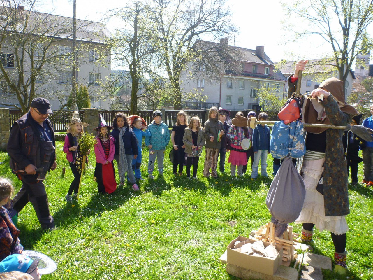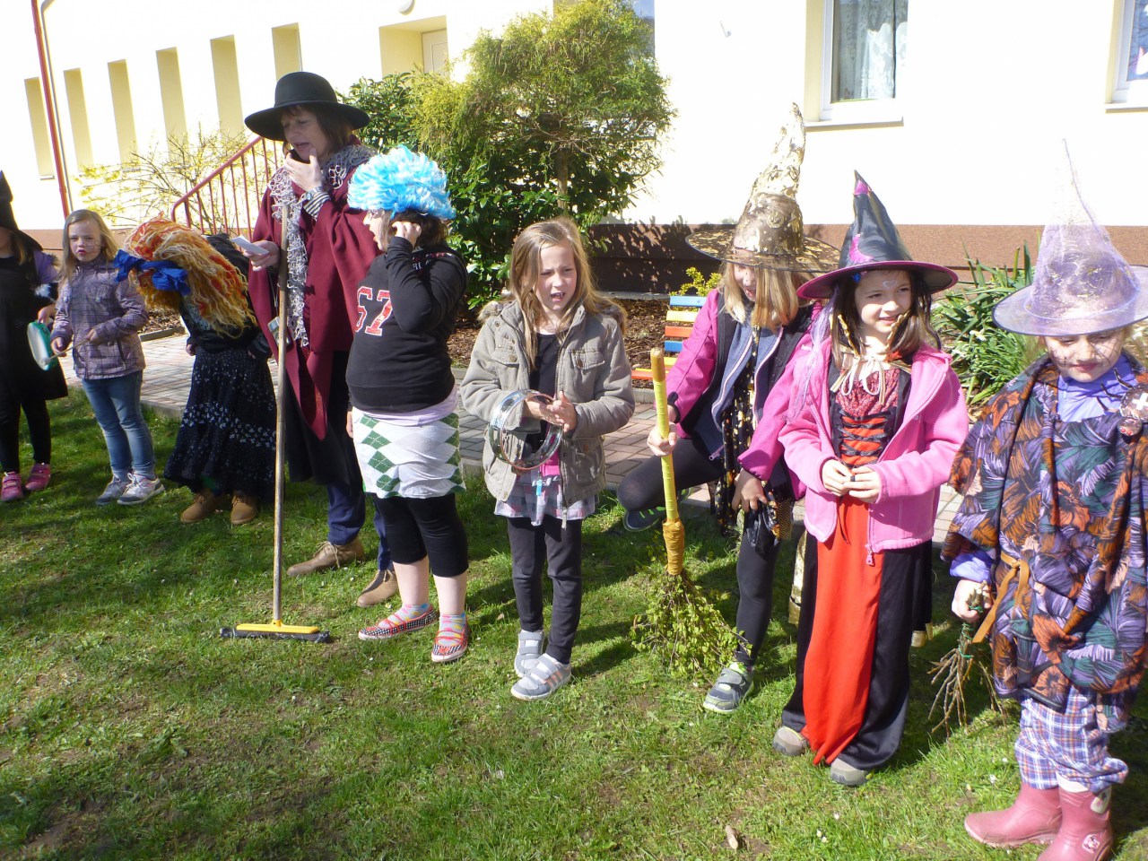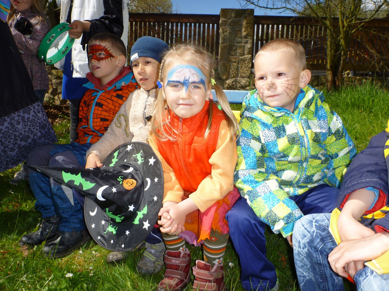 jsme si užili pálení čarodějnic. Ve slunečný den 29.4. jsme všichni - žáci, děti, učitelky vyrazili k pranýři na náves a kolem hasičárny zpět do školy v přestrojení v hrůzostrašné i mírumilovné čarodějky a čaroděje. Cestou jsme zpívali čarodějné písně a různá zaříkávadla. Doufáme, že jsme nikoho příliš neočarovali. Ve školní zahradě jsme pak upálili naši Moranu a snad se tak už zima nebrátí a čekají nás již jen samé příjemné jarní dny...