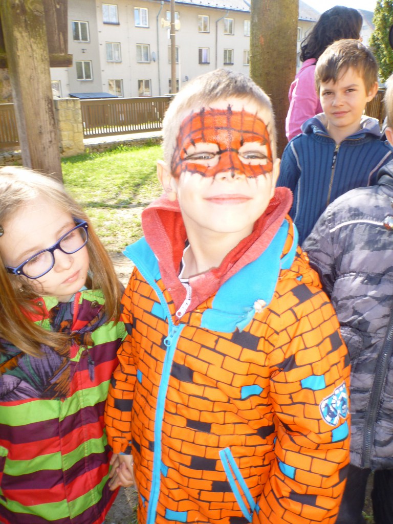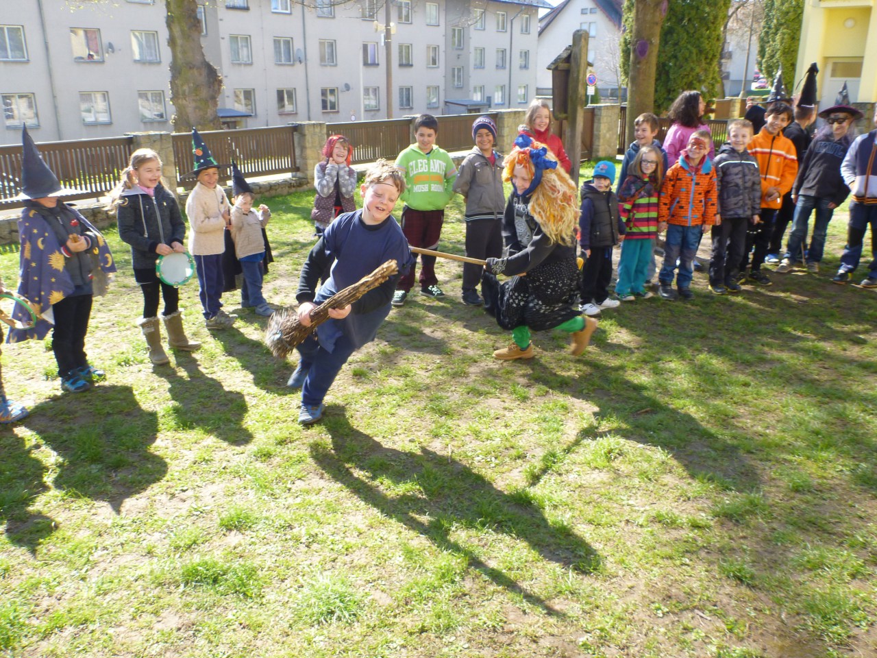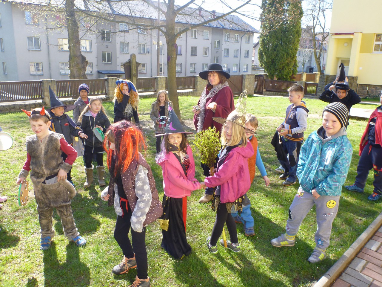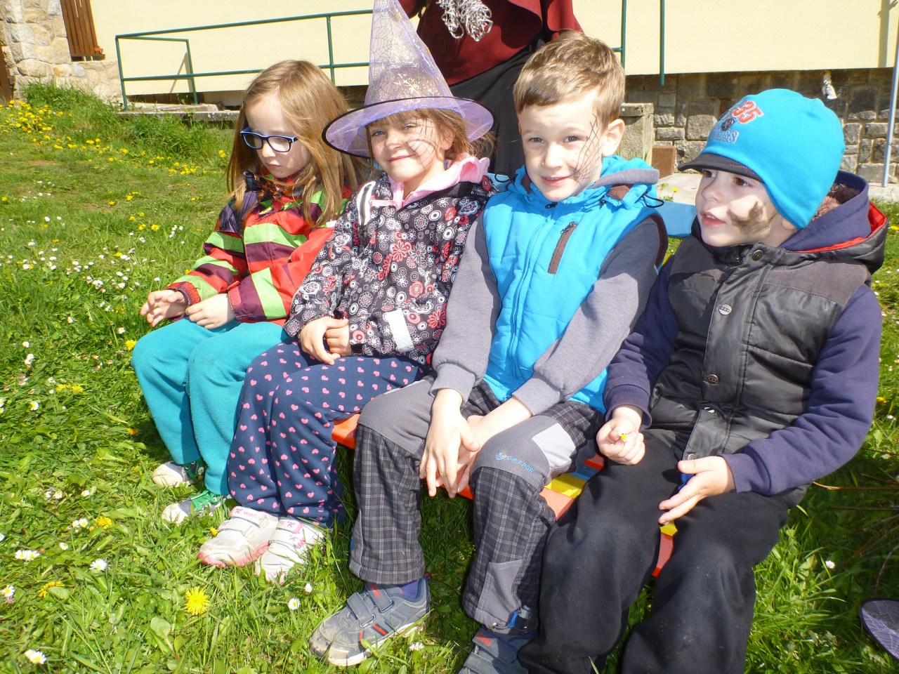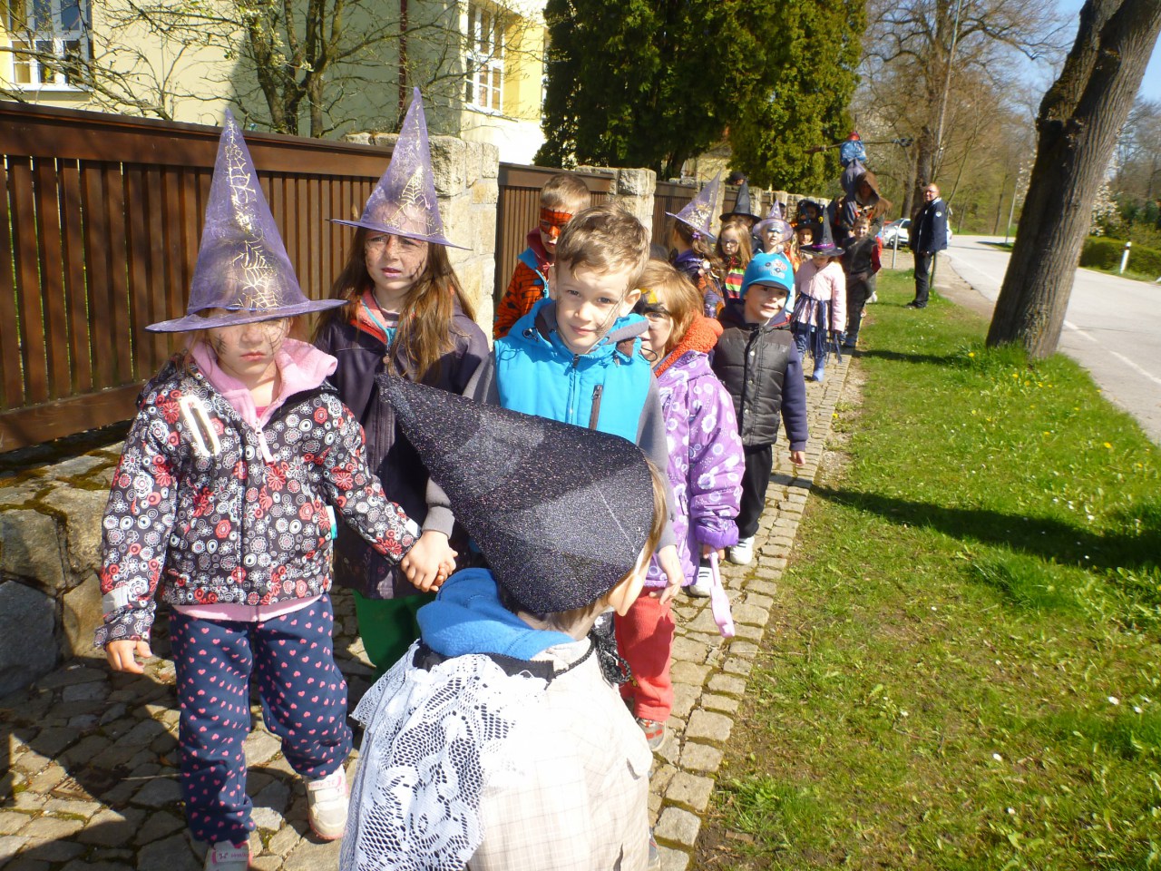 jsme si užili pálení čarodějnic. Ve slunečný den 29.4. jsme všichni - žáci, děti, učitelky vyrazili k pranýři na náves a kolem hasičárny zpět do školy v přestrojení v hrůzostrašné i mírumilovné čarodějky a čaroděje. Cestou jsme zpívali čarodějné písně a různá zaříkávadla. Doufáme, že jsme nikoho příliš neočarovali. Ve školní zahradě jsme pak upálili naši Moranu a snad se tak už zima nebrátí a čekají nás již jen samé příjemné jarní dny...