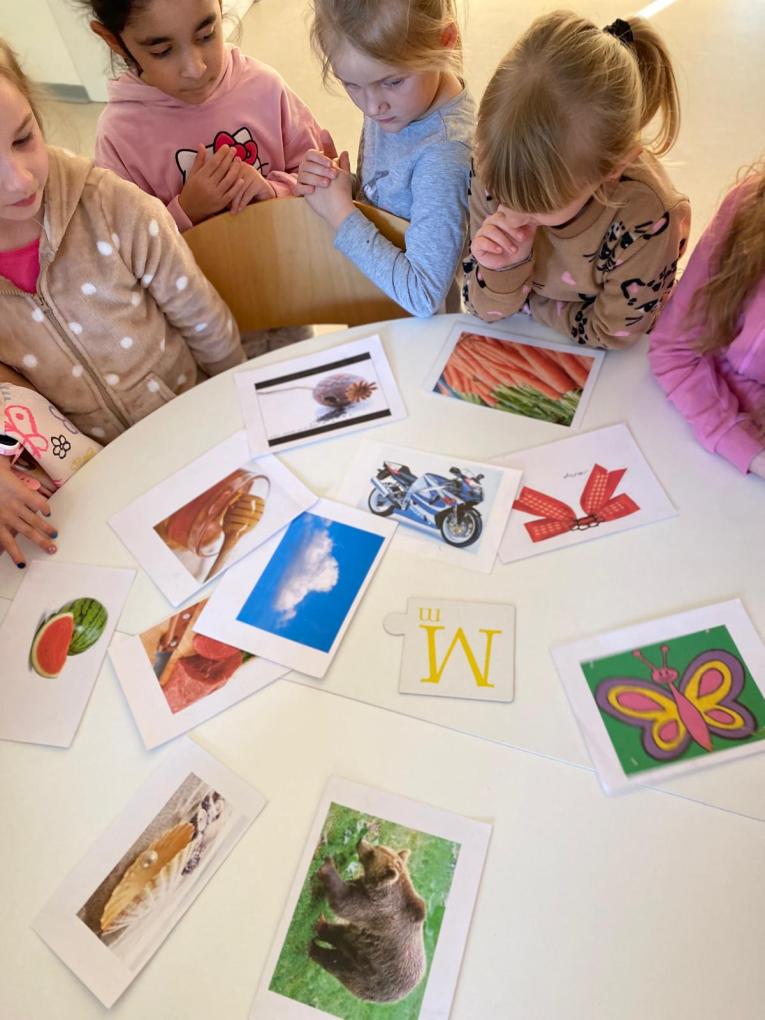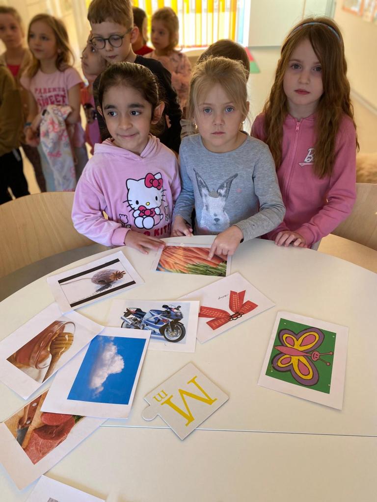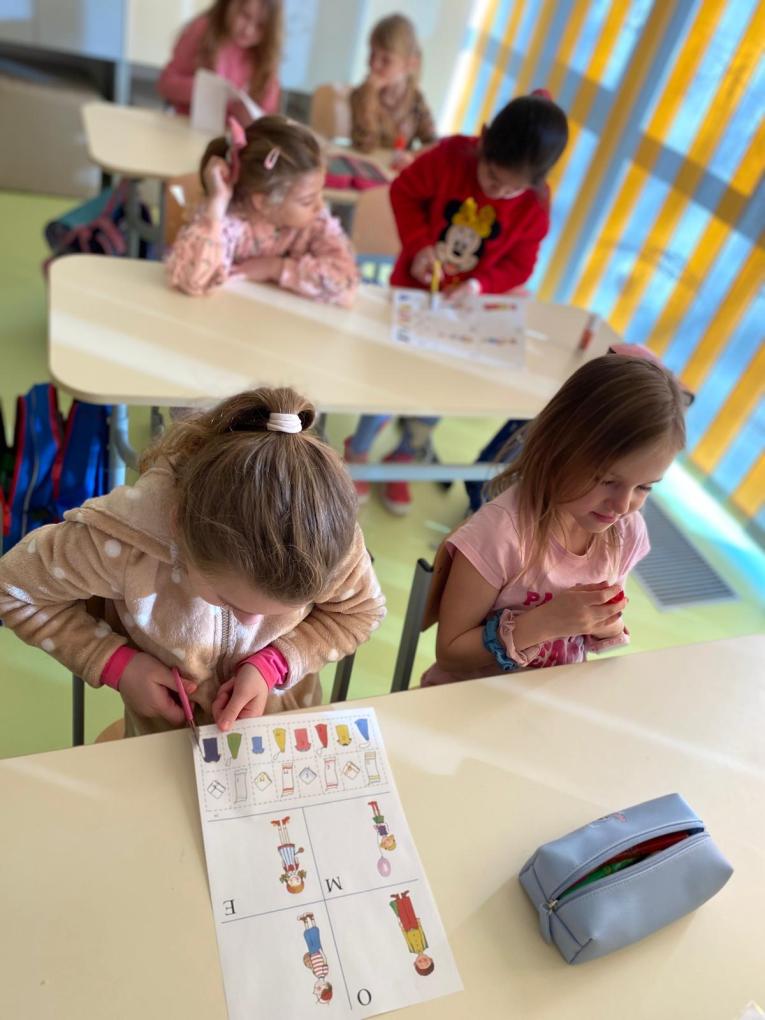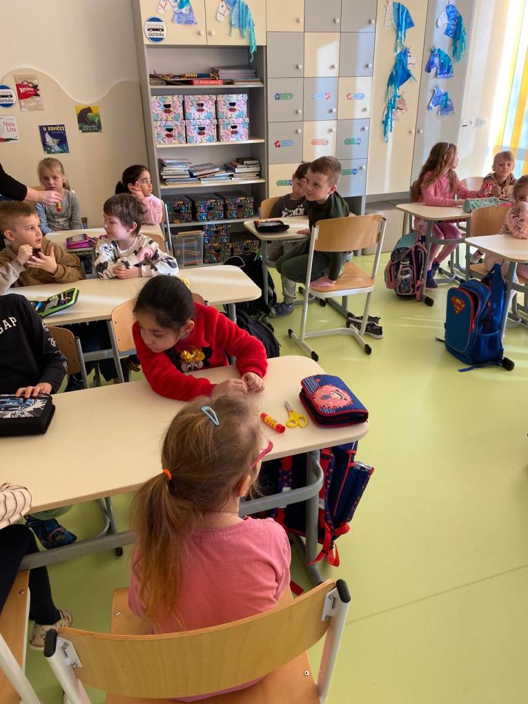 Společně poznávaly písmenka pomocí obrázků a poté ve dvojicích (školkové dítě a prvňáček) spolupracovaly na pracovním listu zaměřeném na zrakové vnímání a písmena. Společná hodina se všem líbila a už se těšíme na další setkání!
