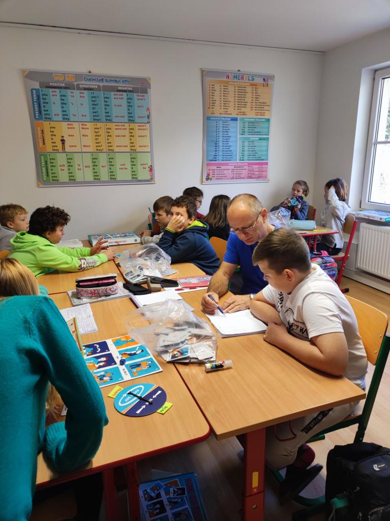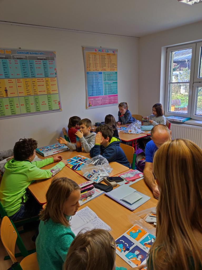 Rádi bychom vás nechali vhlédnout do toho, jak to vypadá v hodině angličtiny u starších dětí, když tvoří věty k překladu. Slovesa losují z pytlíku, o podmětu rozhoduje vrh kostkou a o čase to, kde se zastaví střelka.